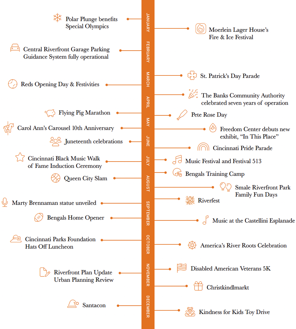 The Fourth Quarter 2025 closed out a very active and engaging year for The Banks. The Freedom Center educated us with a new exhibit, “In This Place,” answering the pivotal questions about why the National Underground Railroad Freedom Center is located in Cincinnati and why it sits on the banks of the Ohio. Cincinnati Parks and Moerlien Lager House engaged us with a Schmidlapp Lawn display of photographs of the Ohio River from 1775 to the present day, celebrating America’s River Roots and 250th year celebration. Historic river craft lined the Public Landing and visitors toured the paddle wheel boats and enjoyed river cruises and entertainment throughout Cincinnati’s Riverfront Parks system including Smale Park. The Banks Community Authority entertained us along Freedom Way and in the DORA, celebrating with block parties, sports-related events and rallies, and community events in cooperation with Smale Riverfront Park and sponsors who support the vision of a vibrant, mixed-use development defining a thriving riverfront district for the City of Cincinnati, Hamilton County, and The Banks stakeholders.