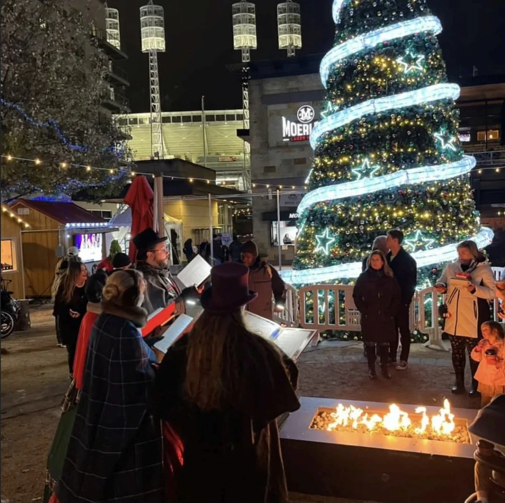 Warm harmonies rise as carolers sing fireside at Christkindlmarkt. Photo credit: Moerlein Lager House Christkindlmarkt