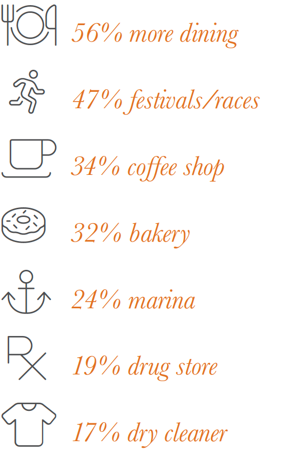 When prompted to mention the new attractions they’d like to see at The Banks of the future, respondent comments ranged from offering condominiums for sale to stabilize the district; more public art, improved signage and maps to guide visitors; to more variety in restaurants (including menu and price points), and more festivals and civic events to generate visitor traffic while enhancing Smale Riverfront Park.