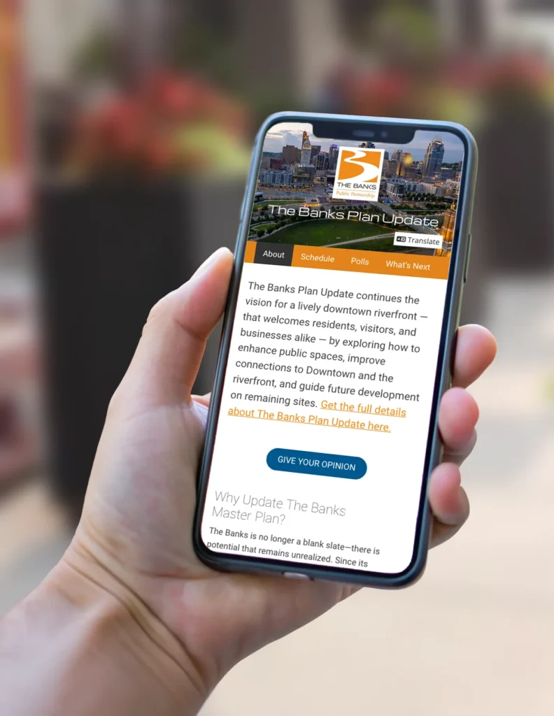 Throughout Phase 1: The Banks Plan Update website www.RiverfrontUpdate.com provided periodic planning updates and engagement opportunities. Since June 2025, the planning team posted two polls periodic polls designed to include the community of residents and users of The Banks in the planning process. Over 500 total responses were received for the two polls combined.